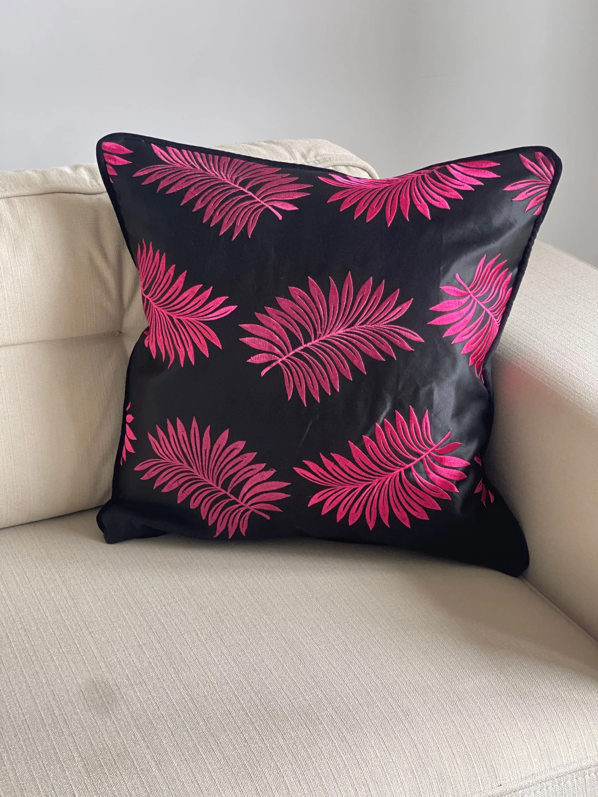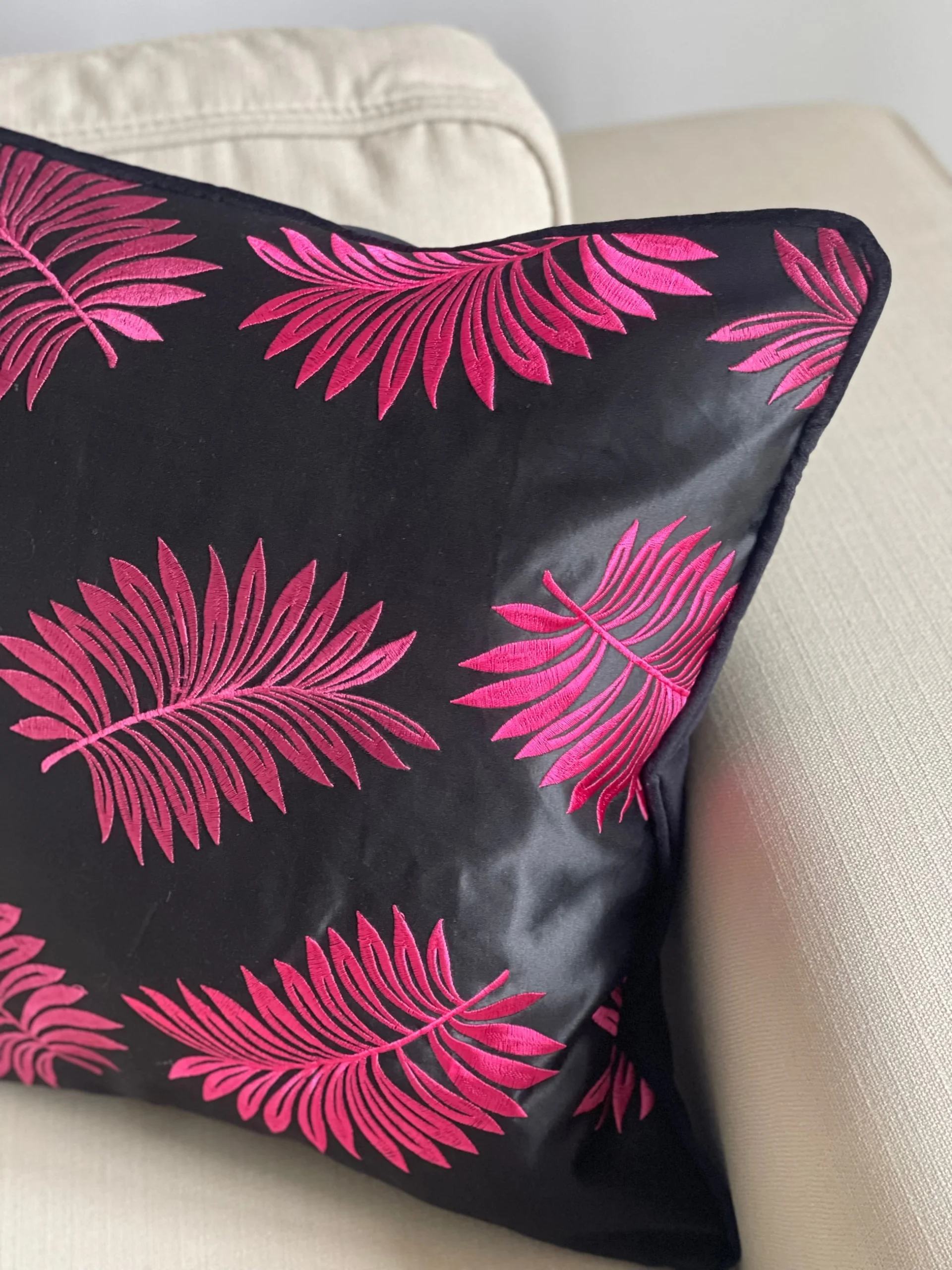 Pembe Yaprak Nakışlı 2’li Siyah Yastık Kılıfı